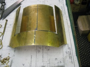Time to cut brass. The cab is made from 18g brass, quite sturdy. The first brass to be cut was the spectical plate on tho of the boiler A relatively simple operation but the curvature had to match the cladding and fortunately marking out from the cardboard template produced a reasonably good fit with only some light filing here and there to get the fit.